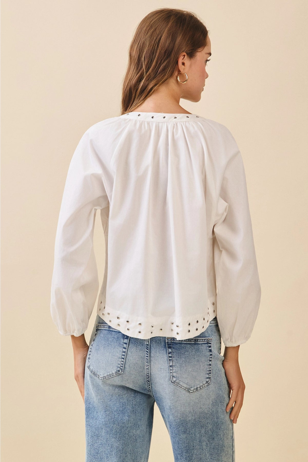 A split neckline blouse featuring long puff sleeves with elastic cuffs, finished with silver stud embellishments along the neckline, front placket, and hem.