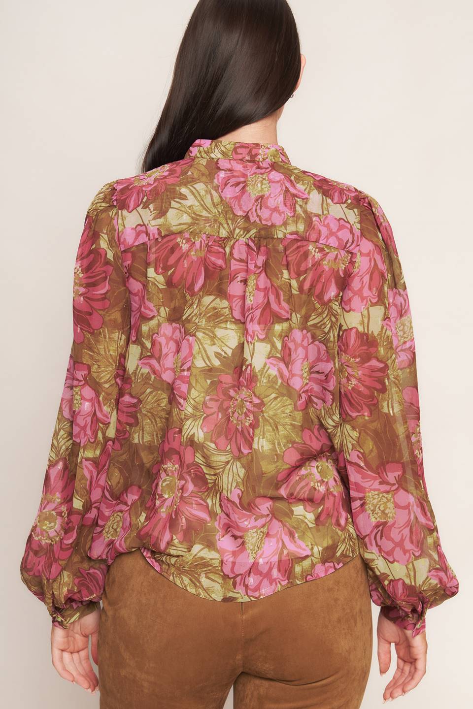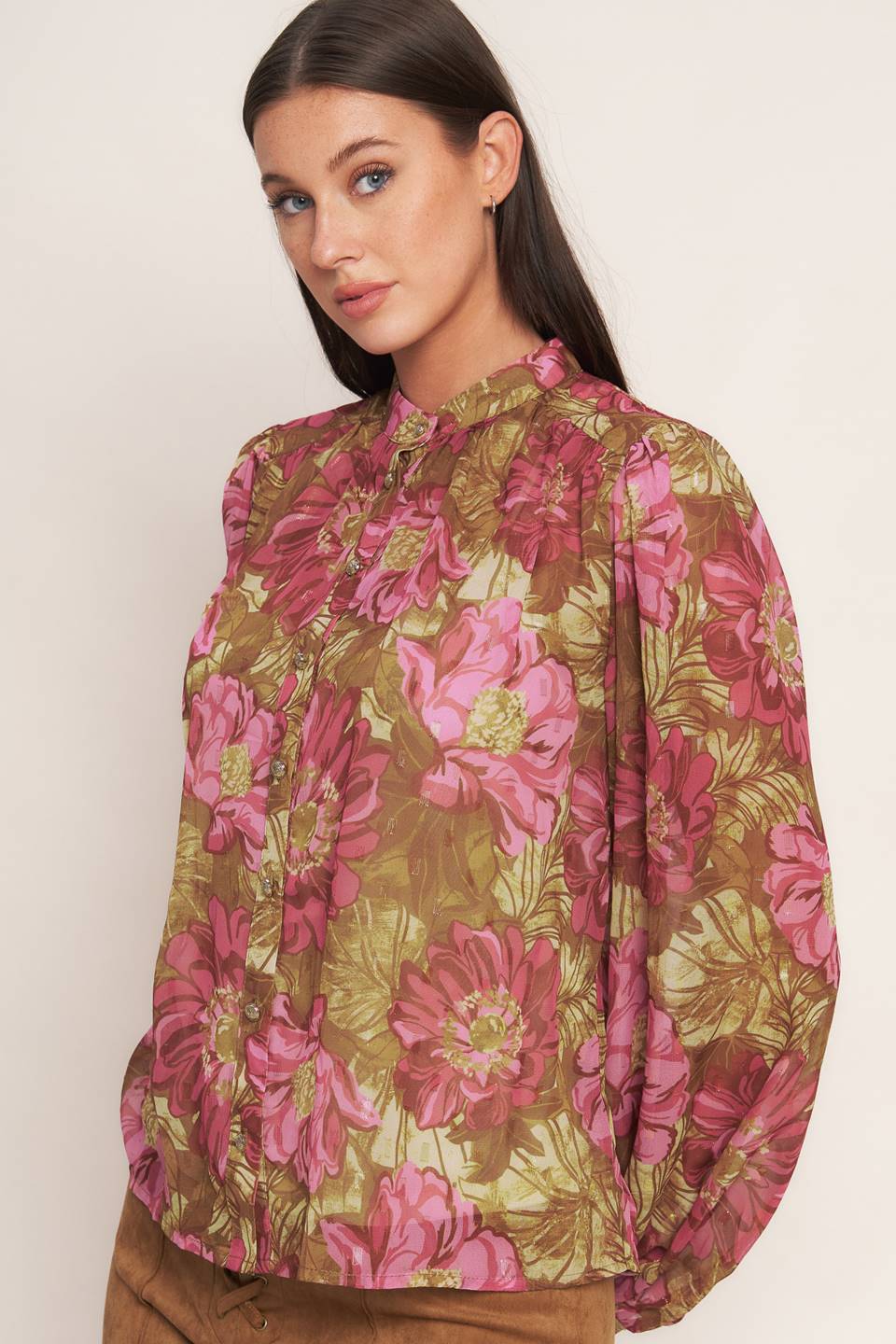 A printed woven top featuring china collar, long sleeve, front button down
