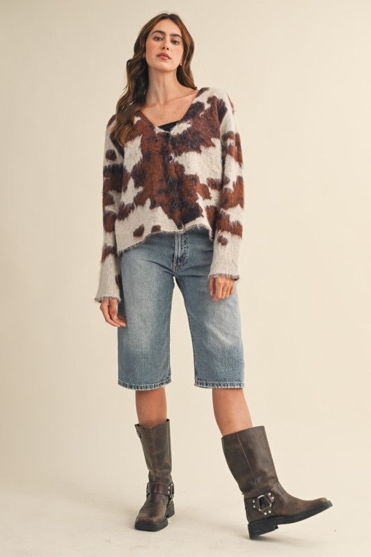 Abstract cow print cardigan sweater.  Drop shoulder, waist length style.