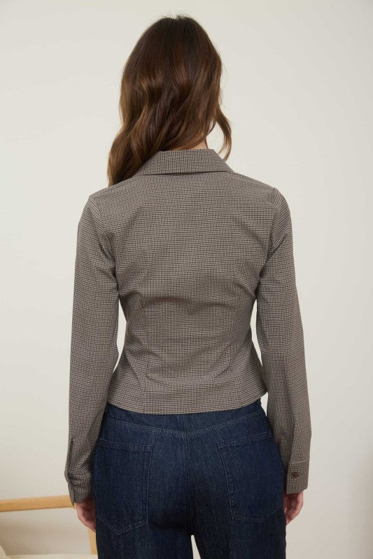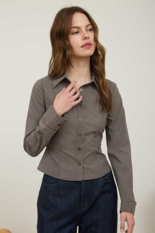 Mini plaid print, collared long sleeve, button front top. Fitted with the perfect amount of stretch.