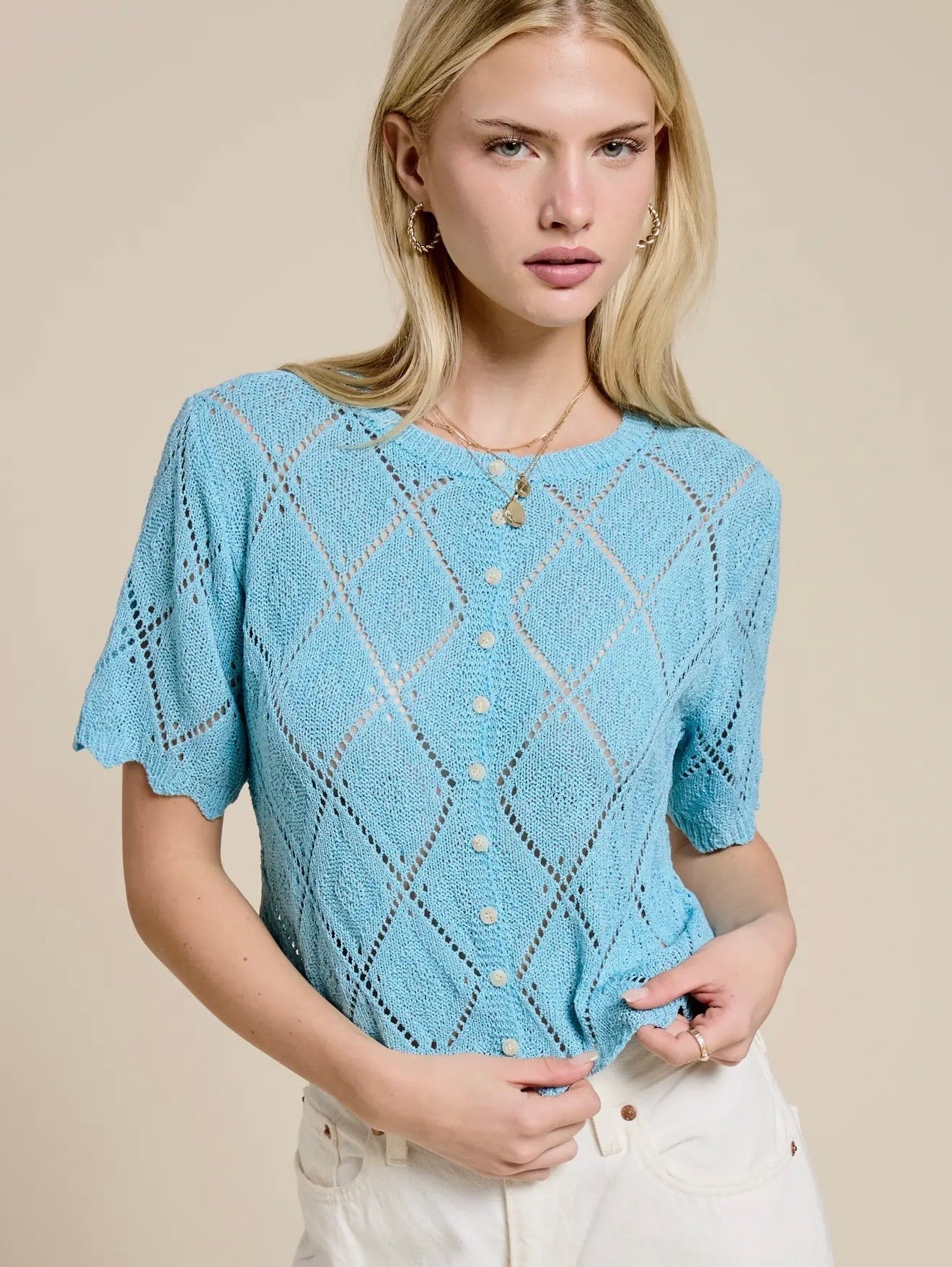This short sleeve knit cardigan features a diamond pointelle pattern. It has a round neck line, button front closure, and ribbed edges along the hem line and sleeves.